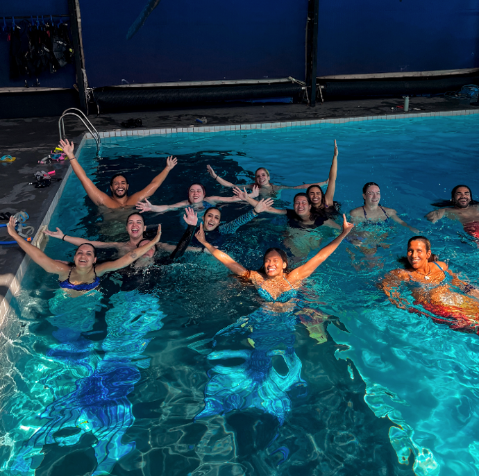Duas sessões em águas confinadas (piscina) para aprender e se preparar para o mergulho de sereia, habilidades de resgate/gerenciamento de problemas e a condução de mergulhos de sereia.